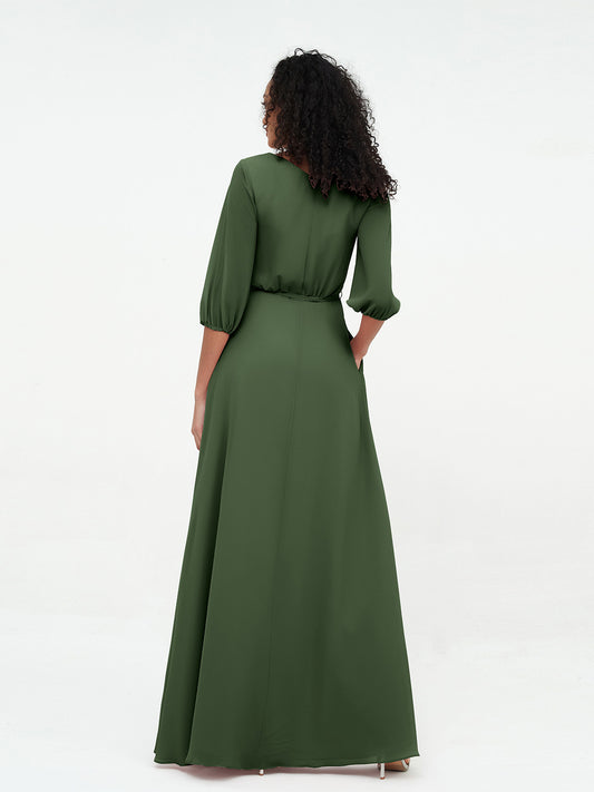 Babaroni UnaVestidos máximos de chiffon con escote en V profundo y mangas 1/2 Verde Oliva