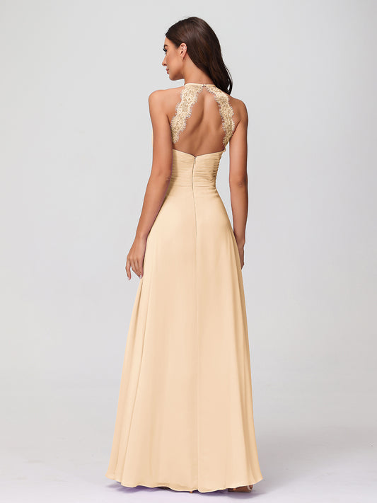 Adalyn Escote En V Gasa Y Encaje Maxi Corte De Dama De Honor Melocotón