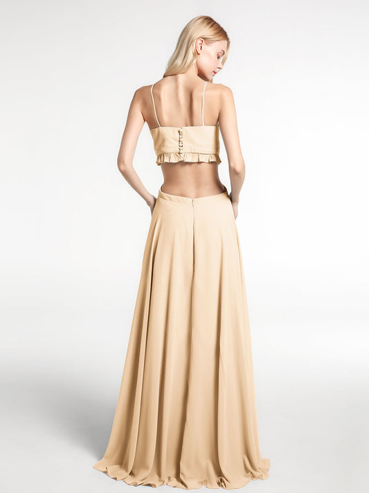 Babaroni EudoraVestido sexy maxi de chiffon con tirantes finos y detalles de volantes recortados Melocotón