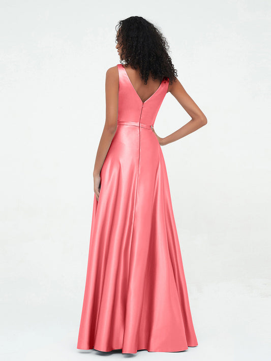 Vestidos máximos de satén estilo A-line con escote en V y bolsillos Sandía
