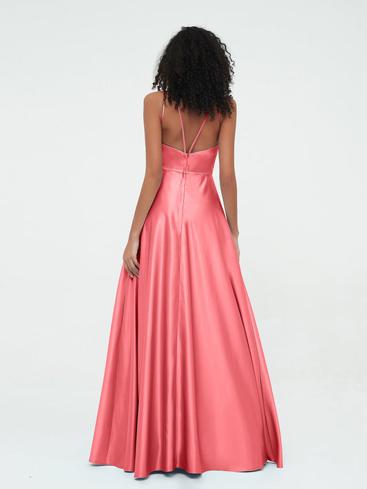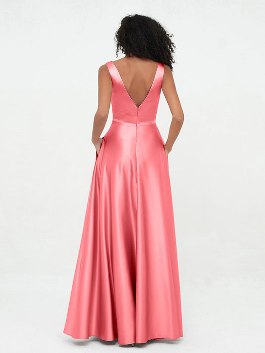 Babaroni SadeVestidos máximos de satén estilo princesa con escote en V y bolsillos Sandía