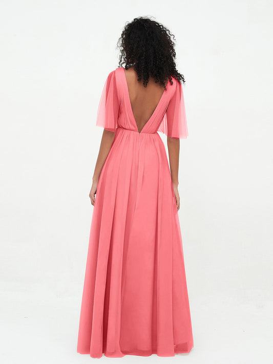 Babaroni KatherineVestidos máximos de tul estilo A-line con escote en V profundo en la espalda Sandía