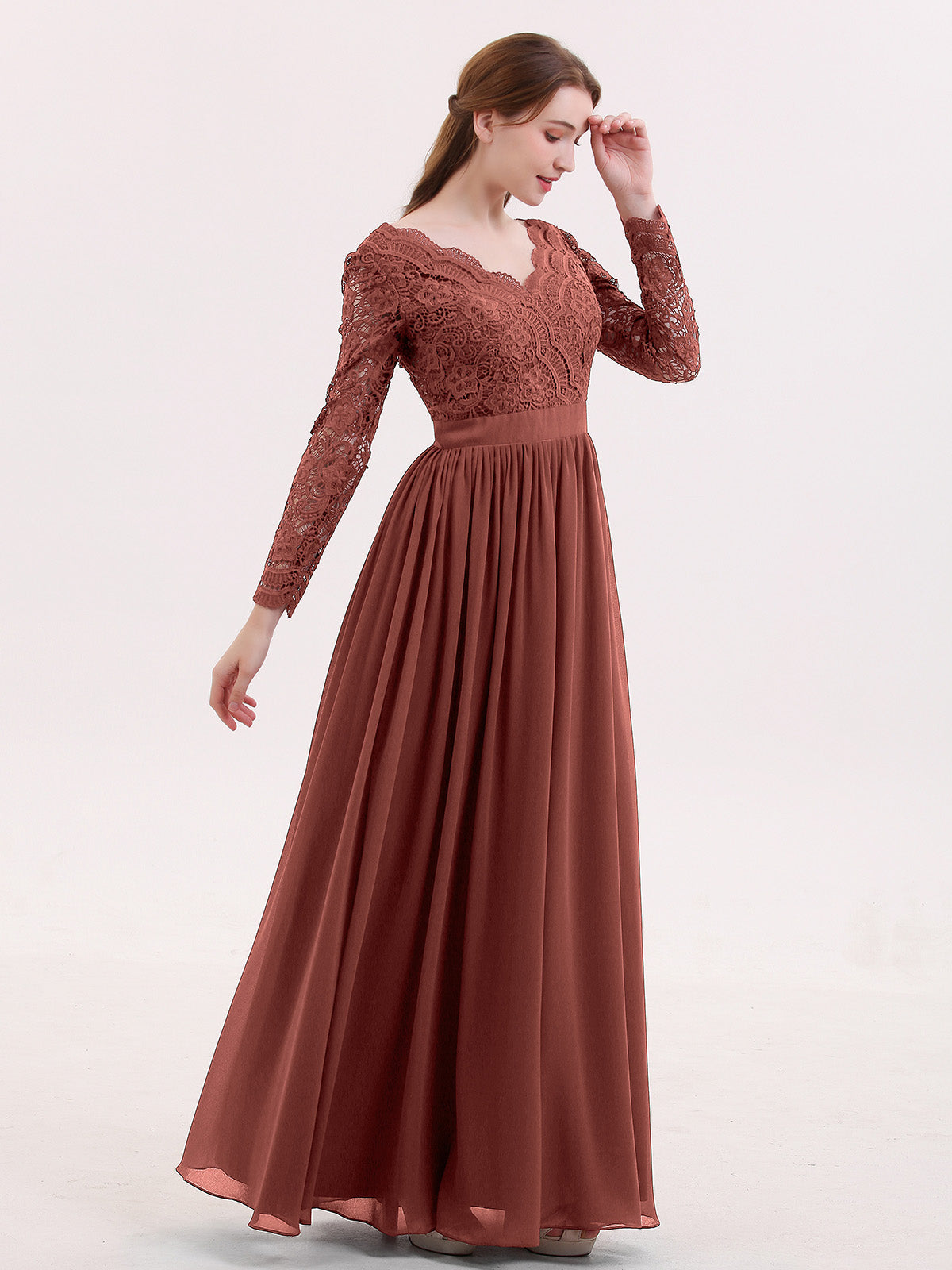 Alina Escote En V Encaje Y Gasa Vestido Con Largas Mangas Terracota