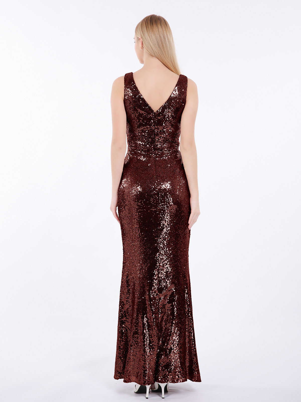 • El largo vestido se caracteriza por el corpiño de lentejuelas, escote en V con cremallera, es muy femenino.