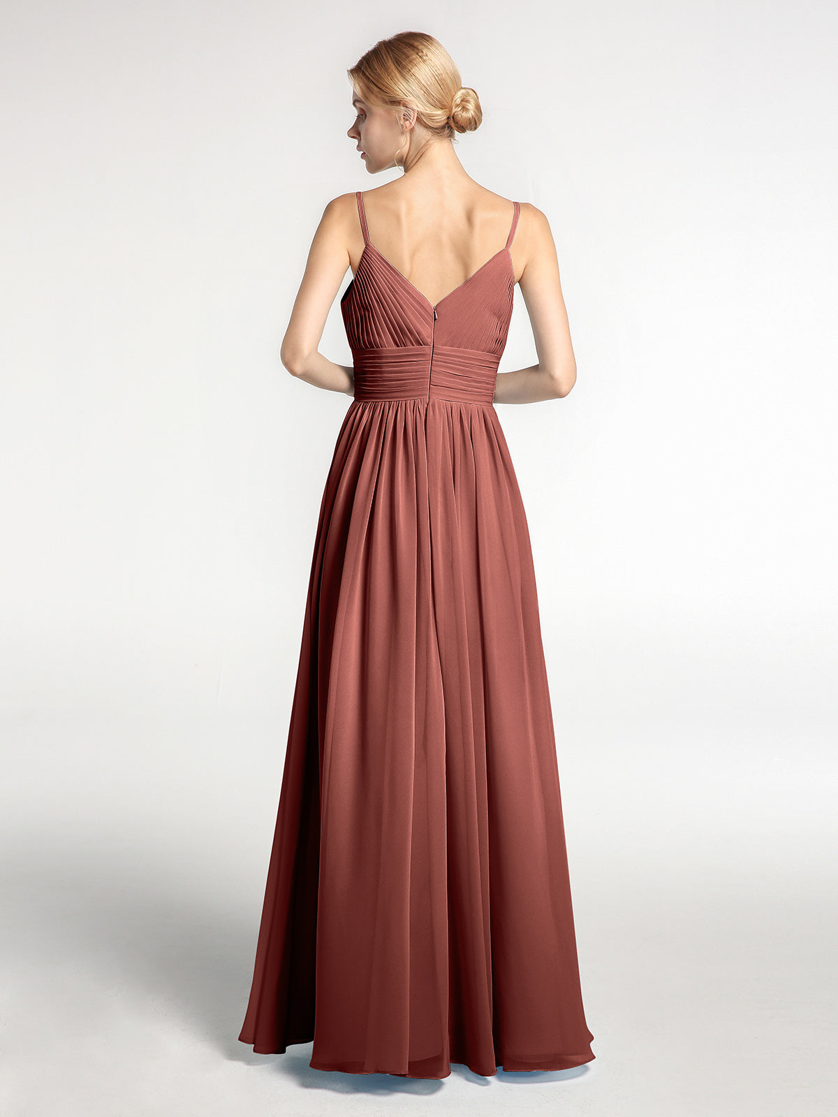 • Es un vestido de dama de honor con corte A y corpiño plisado en gasa simple.