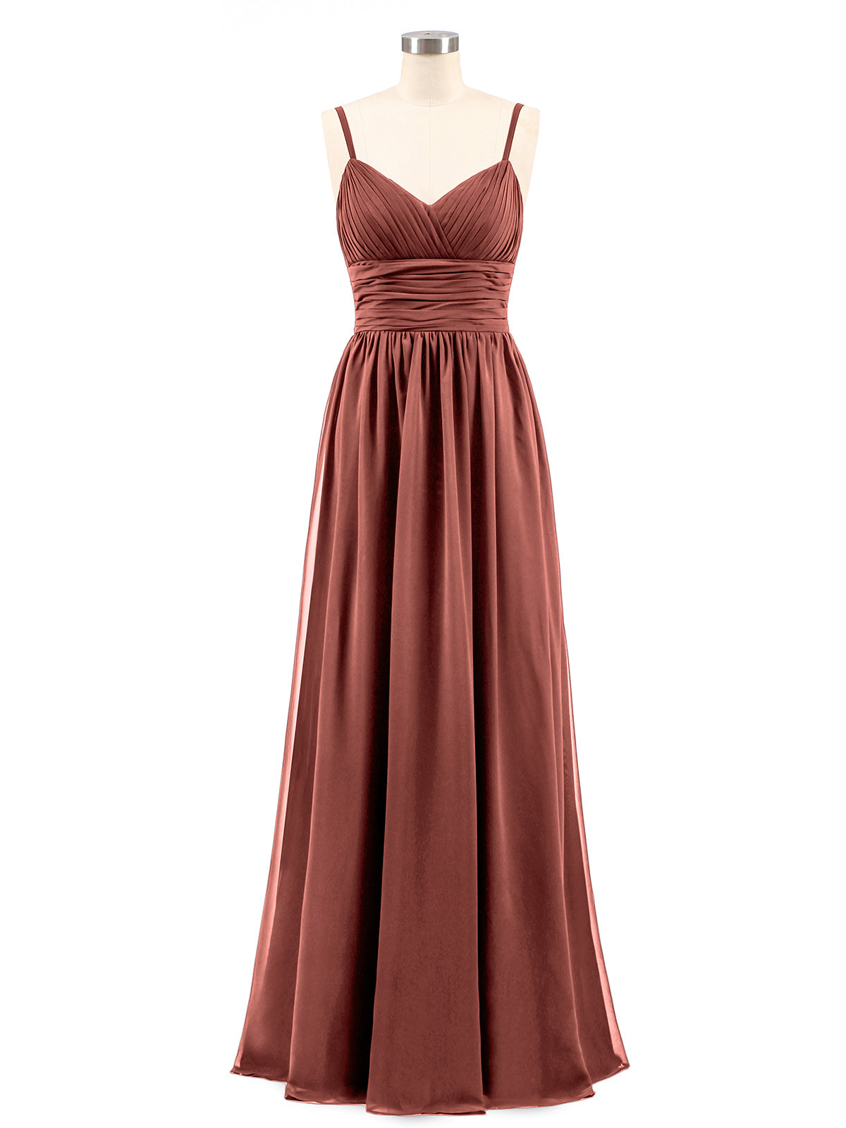 • Es un vestido de dama de honor con corte A y corpiño plisado en gasa simple.