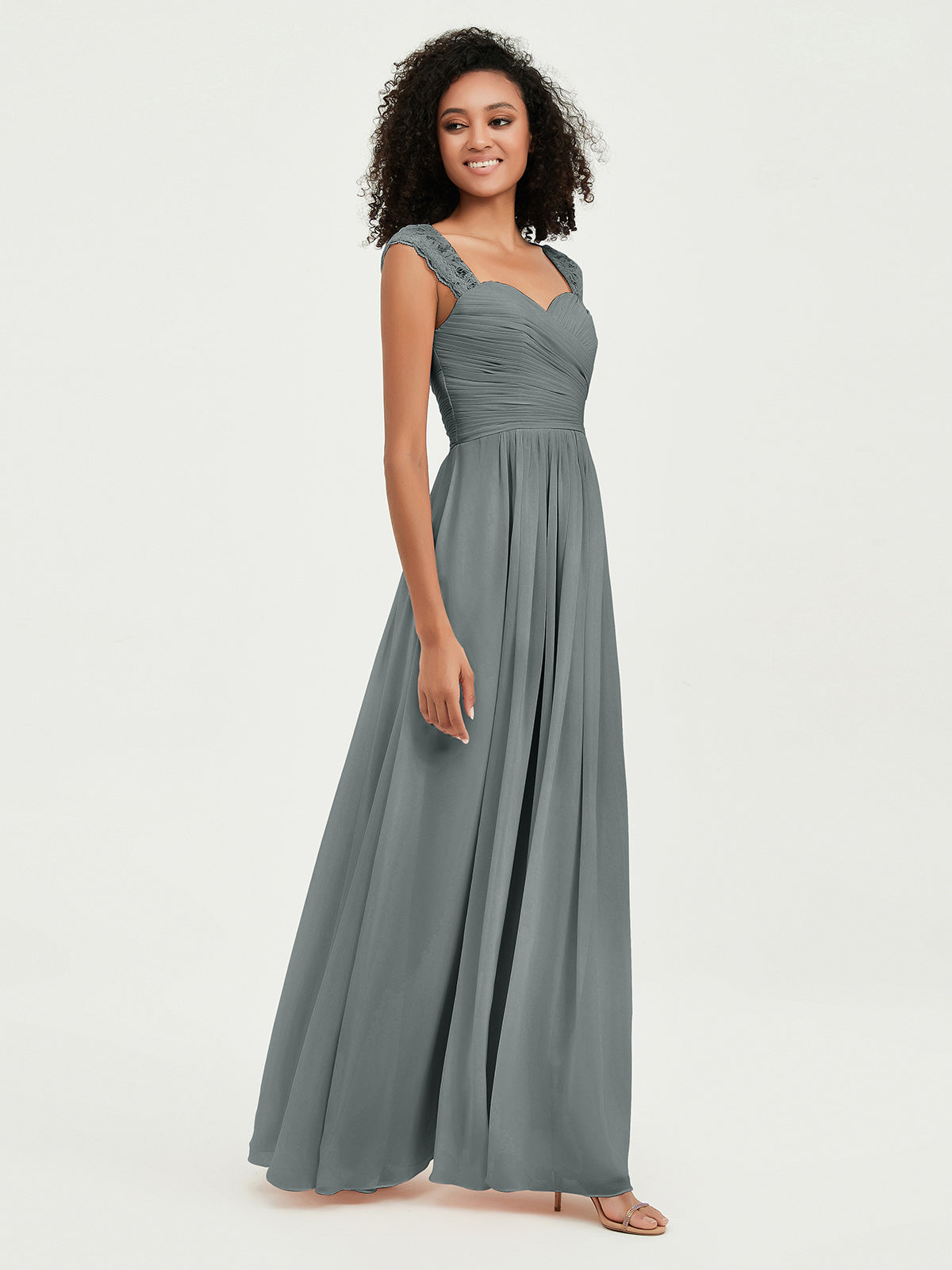 Vestidos de chiffon con escote en corazón y mangas cap de encaje Gris Acero