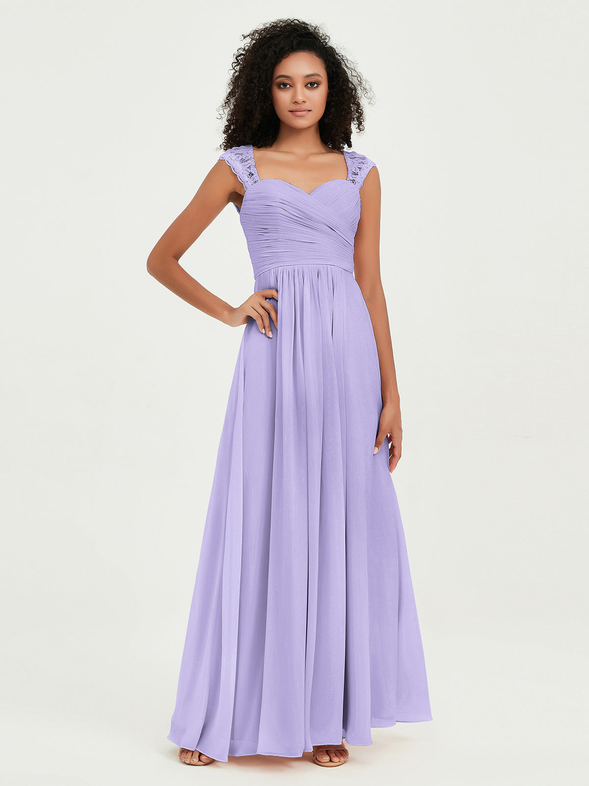 Vestidos de chiffon con escote en corazón y mangas cap de encaje Lila