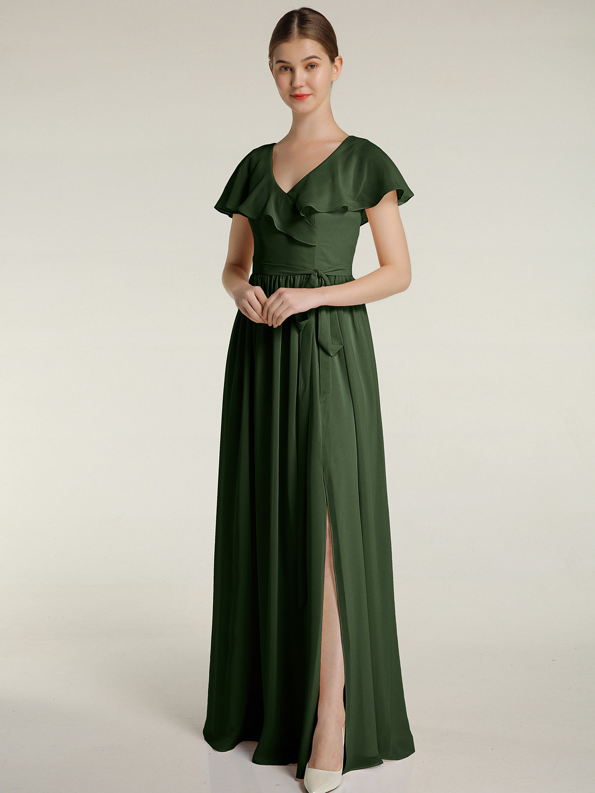 Vestidos largos de chiffon con mangas cap y abertura Verde Oliva